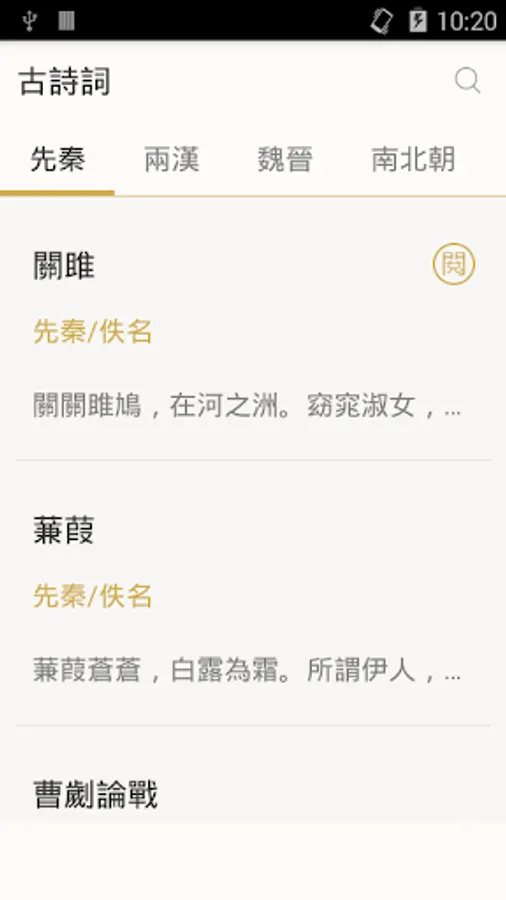 APP contains a total of Qin, Han, Wei, Jin, Southern and Northern Dynasties, Sui Dynasty, Tang Dynasty, Five Dynasties, Song, Jin, Yuan, Ming Dynasty, Qing Dynasty, a total of 3780 ancient poetry, covering the Tang, Song, Yuan, poetry , Chu, full Tang, Song and other classics whole, to help you learn poetry annotation, interpretation and appreciation. It is like a spirit of the Yangtze River, the Yellow soul, the people nurture, cultivate character, nurtured generations of descendants.