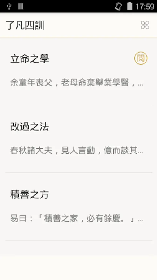 了凡四訓,種德立命、修身治世類教育書籍。作者為明代袁黃,字坤儀,後改名了凡,作於六十九歲,全文分四個部分。作者以自己的親身經歷,講述了改變命運的過程。原本為教訓自己的兒子,故取名訓子文;後為啟迪世人,遂改今名。