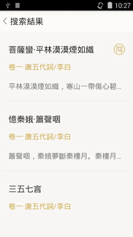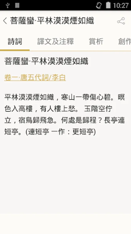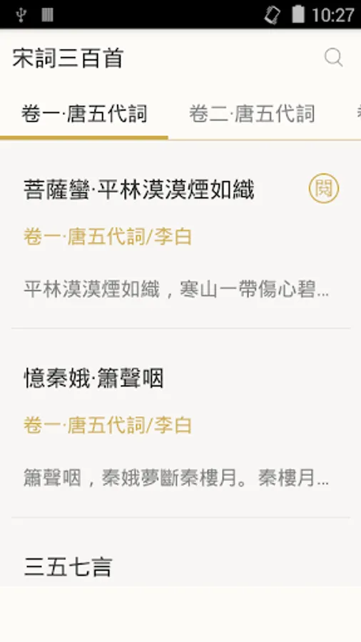 1 classification details, this APP contains the following categories: Volume Tang and Five Dynasties, Tang and Five Dynasties Volume II, Volume III · Northern Song Dynasty, Volume IV · Northern Song Dynasty, Song Ci · Kango, Juan Liu · Northern Song Dynasty, VII · South Song Dynasty, Juanba · South Song Dynasty, Song Ci · Book Nine, ten volumes · South Song Dynasty;