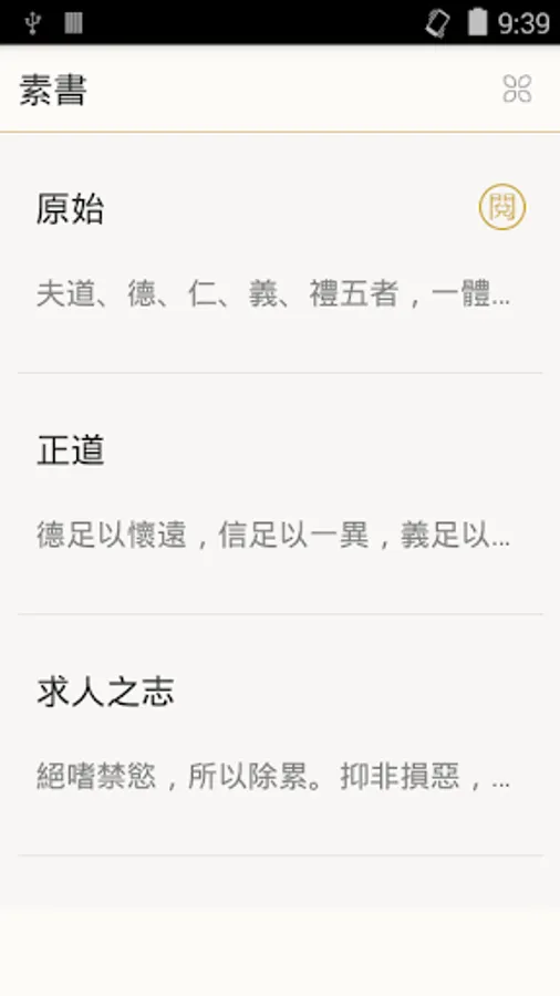 《素書》相傳為秦末黃石公作。民間視為奇書、天書。《素書》以道家思想為宗旨,集儒、法、兵的思想發揮道的作用及功能,同時以道、德、仁、義、禮為立身治國的根本、揆度宇宙萬物自然運化的理數,以此認識事物,對應事物、處理事物的智能之作。傳說黃石公三試張良,而後把此書授予張良。張良憑藉此書,助劉邦定江山。
