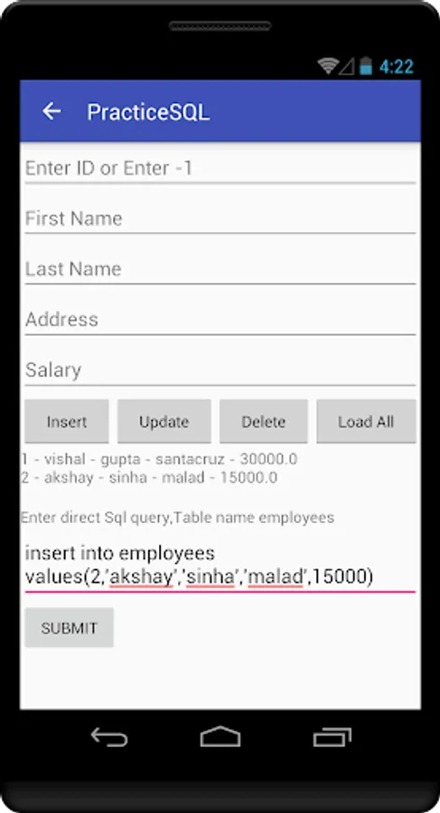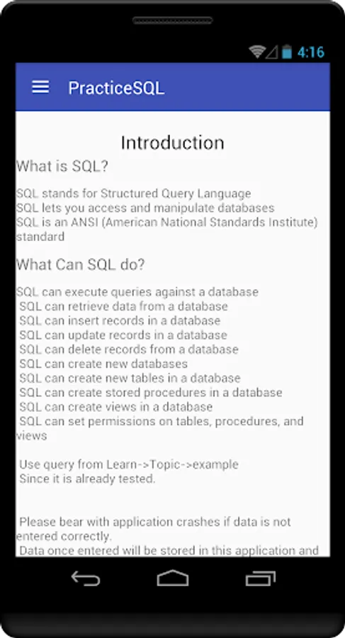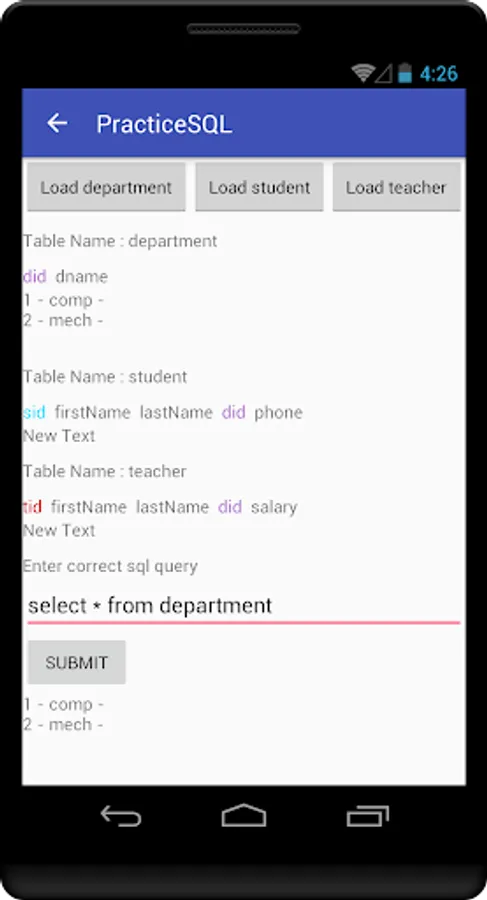 The user interface of this app is simple and responsive. PracticeSQl is a simple application for learning and practicing sql query.It consist of database and tables on which user can fire sql query.The tables are predfined and cannot be changed but if you want to clear your concept then this application is very helpful. User can post their question in Forum and others can help by giving answers.