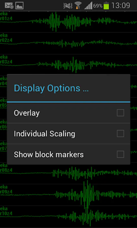 Select which waveform channels to view, or tap to zoom in on one for closer inspection, including Power Spectral Density (PSD) and spectrogram options.