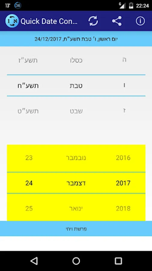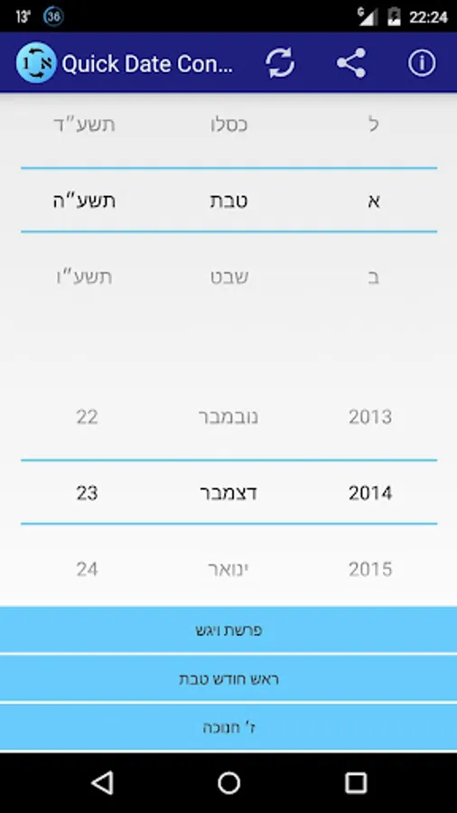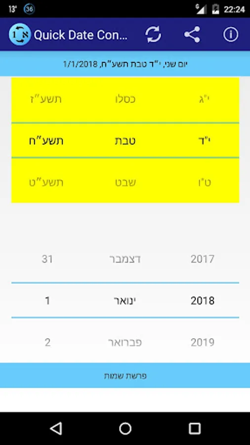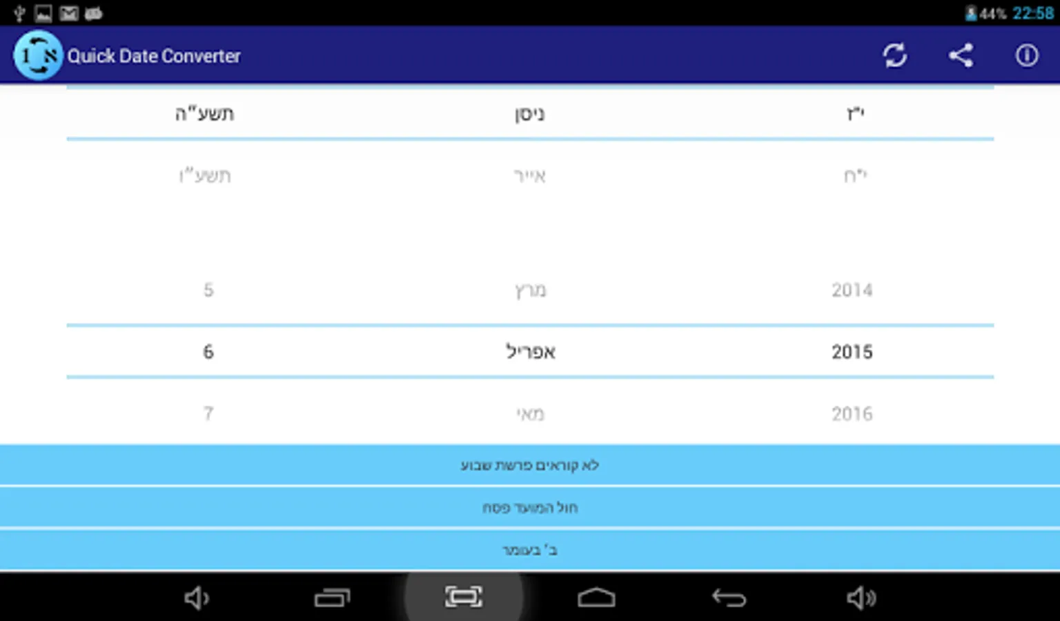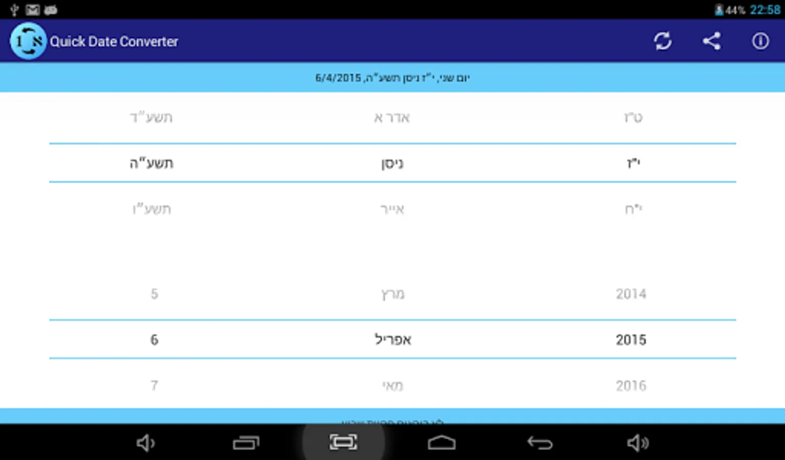 Select your desired Hebrew date, and the Gregorian date will immediately appear at the bottom of the screen.