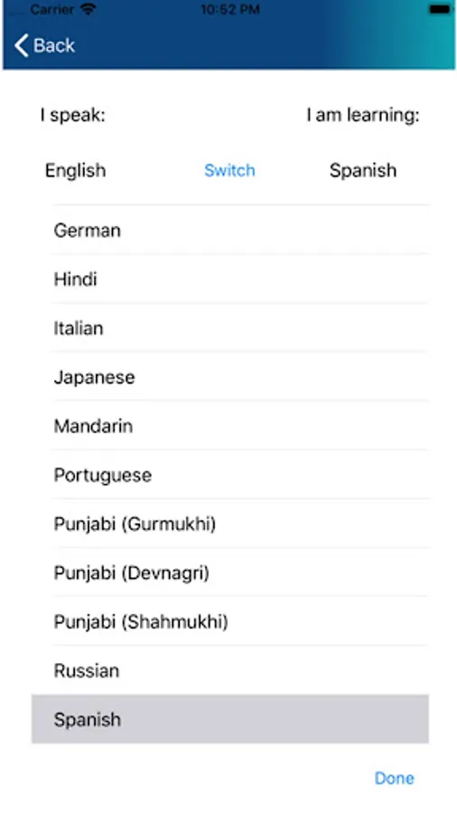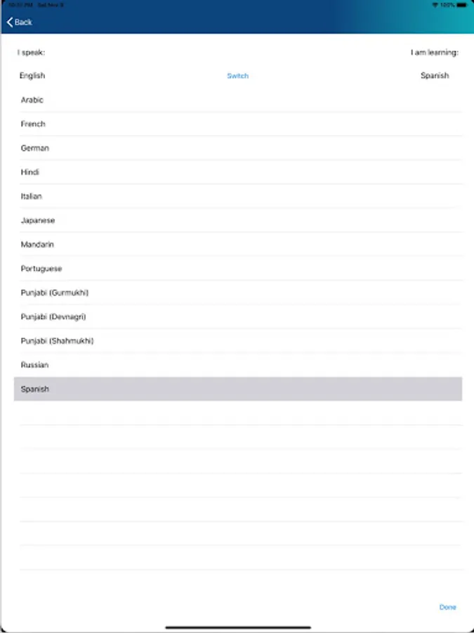 An English speaker, for example, will hear the content in English (L1) once, then will select the number of times the L2 content will play. The ‘switch’ feature allows you to change the order in which you hear each language.