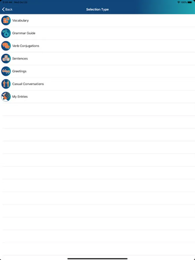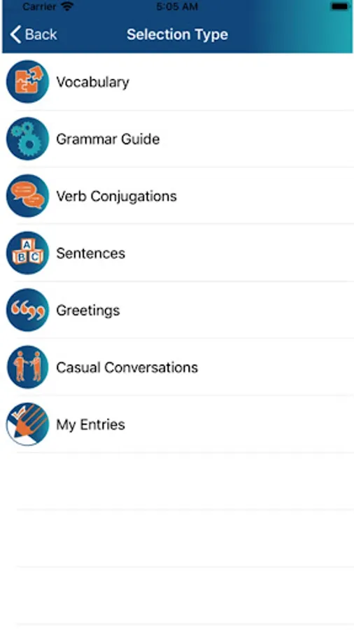 The content is identical in each of the 12 languages and is arranged in categories. Practice verb conjugations, greetings, common topics of conversation and grammar points.
