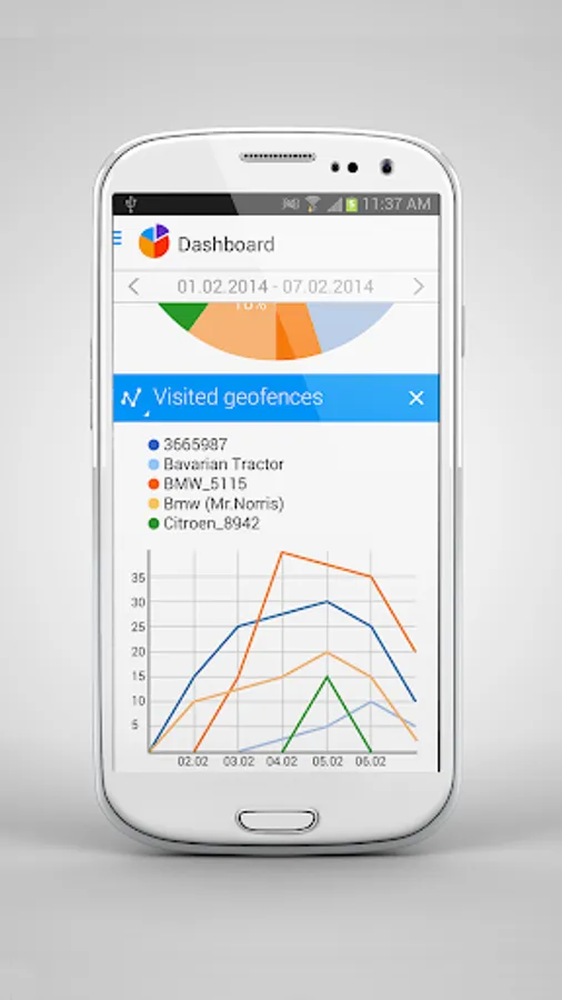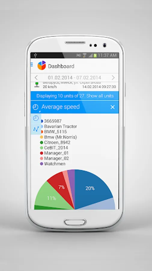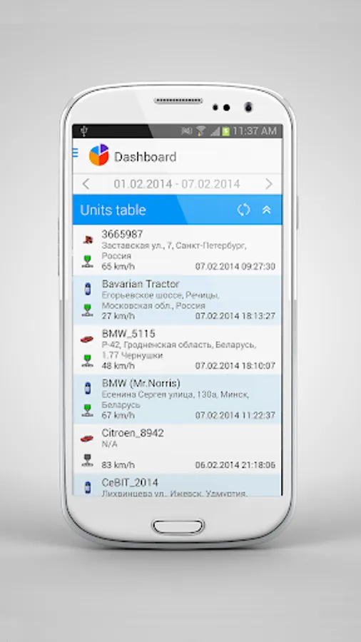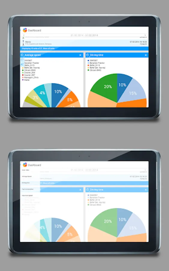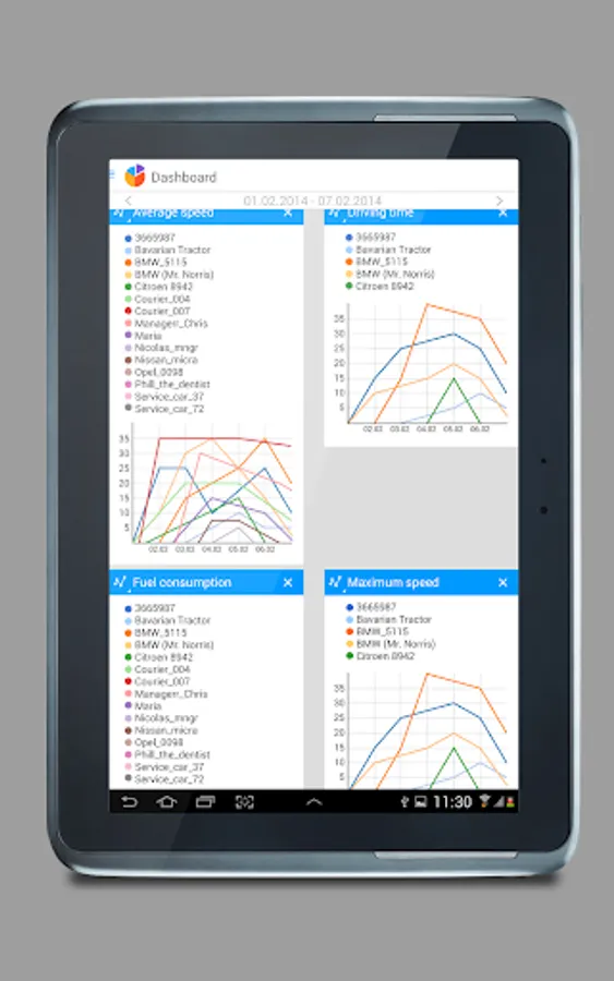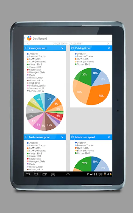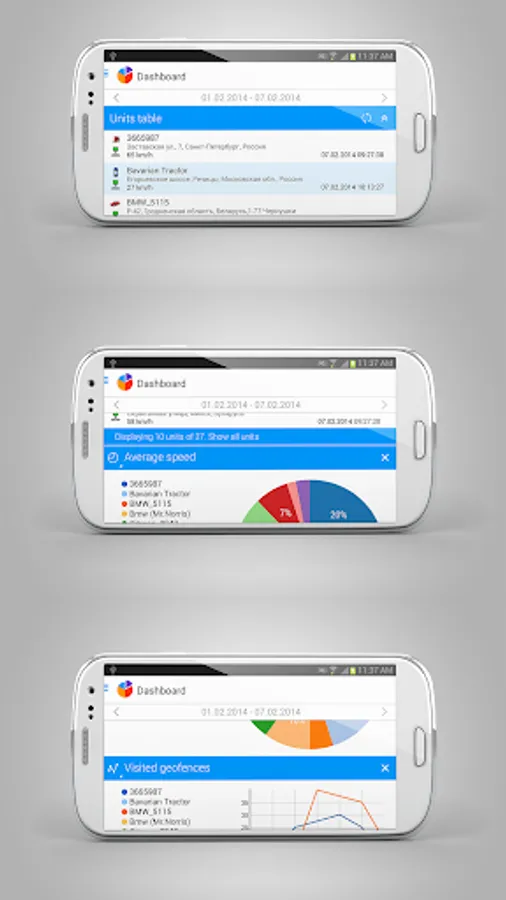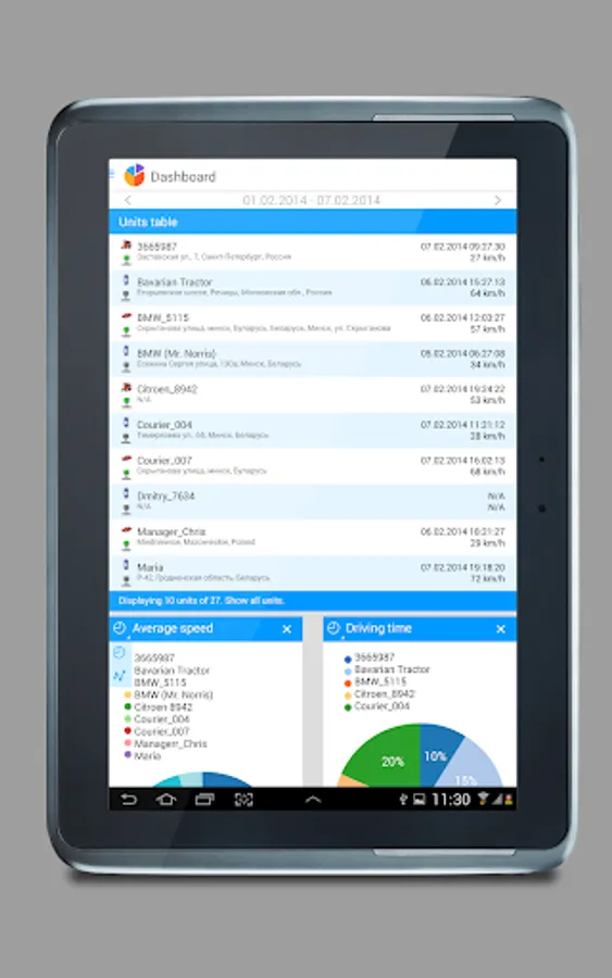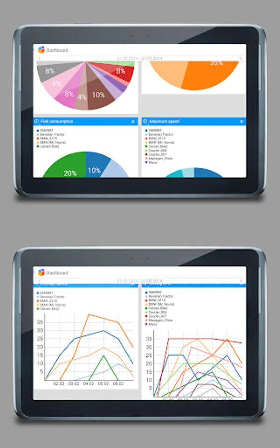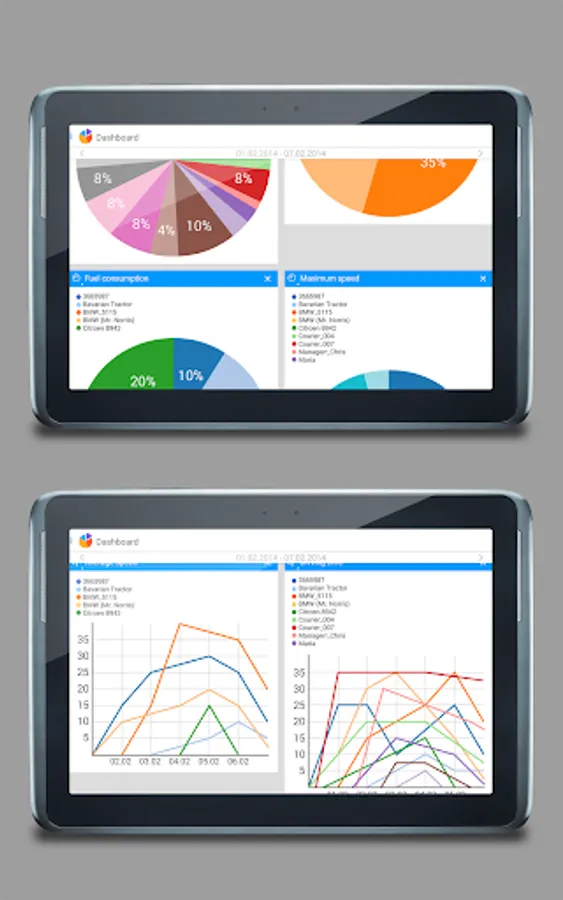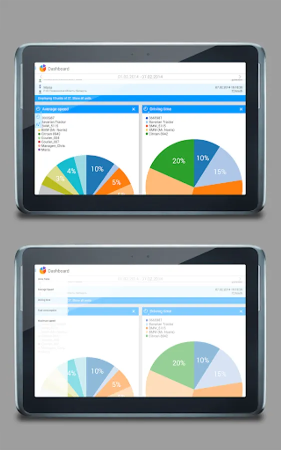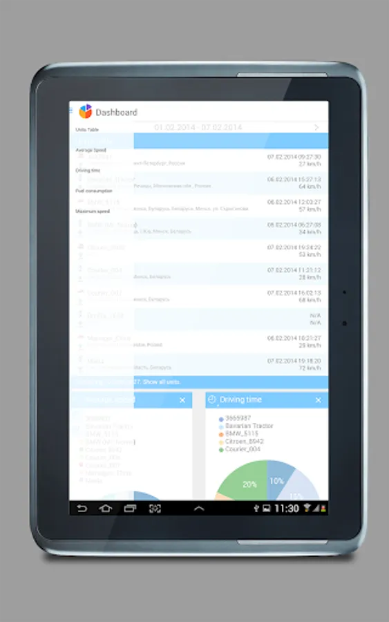 Multifunctional telematics solution by Gurtam, which capabilities extend far beyond simple GPS vehicle tracking. Dashboard provides at-a-glance views of KPIs (key performance indicators) relevant to a particular objective or business process. In our case, Dashboard is an effective Apps, providing overview of fleet KPIs in an easy to read real-time user interface to enable instantaneous and informed decisions to be made immediately. KPIs include Mileage, Fuel consumption, Engine hours, Average and Maximum speed, Idling, Time in trips and visited Geofences. So, you can build all the necessary diagrams by units or unit groups. You can make any diagram you want, for example, mileage diagram for days, weeks, or just for one day. Also, it’s possible to choose the diagram type you like: line, column or pie chart.