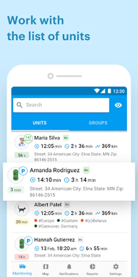 - Units list management. Get all the necessary information on movement and ignition state, data actuality, and unit location in real time.