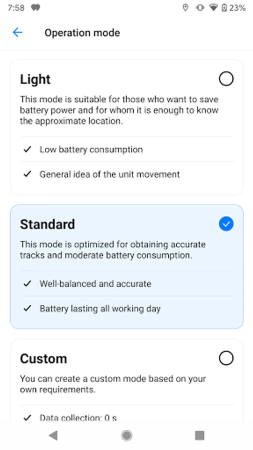 The application supports choosing a user mode from preset ones or creating your own with settings depending on the goals of monitoring. A wide range of settings available allows receiving accurate data while reducing traffic and battery consumption.