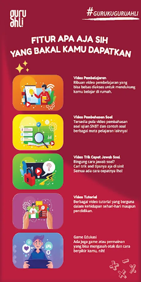 Expert Teachers as learning guidance media are directly guided by teachers who are experts in their fields. also provides learning videos, video discussion of chapter questions for elementary, junior high, high school and vocational school levels, there are also videos discussing SBMPTN questions and independent state university entrance exam questions that can be accessed via smartphones wherever and whenever you can even order offline tutoring in just one application !