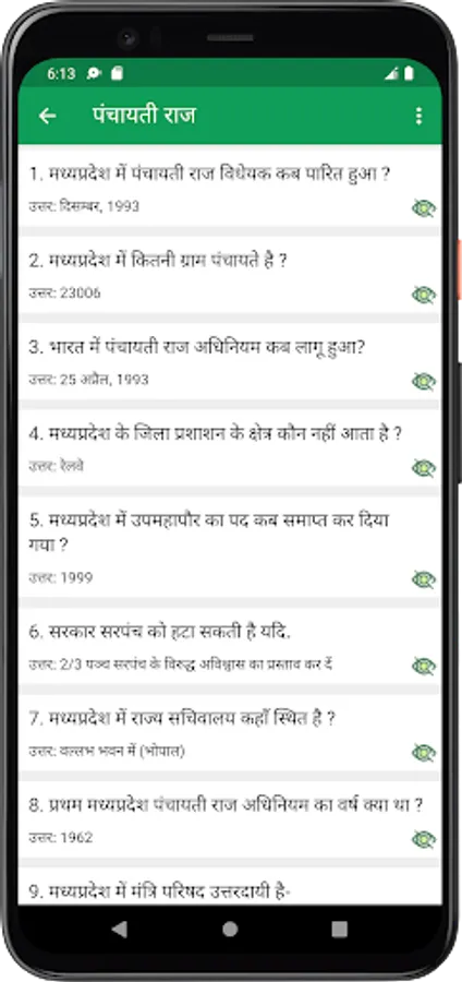 This app provides Panchayati Raj general knowledge questions & answers in Hindi language. This app will facilitate you to prepare for competition exams like: MP PATWARI EXAM (म. प्र. पटवारी परीक्षा), RBI, CAT, UPSC, MPPSC, BANK PO, BANK CLERK, SSC, IAS, IPS, RAILWAY, PSC, POLICE, UPPSC, CISF, MPSC, RRB BANK SPECIAL OFFICER, RPSC, NDA, IBPC, SBI CLERK, CDS, PSU, PATWARI EXAM. It includes exam preparation material for Panchayati Raj general knowledge.