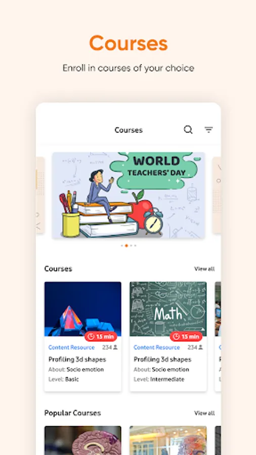 Get unlimited access to all the courses free of cost to enhance the teaching experience through new skills and strategies like classroom management, socio-emotional issues, pedagogy, body safety, stress management, etc. On completing this easy-to-use, self-paced course teachers are provided a certificate.