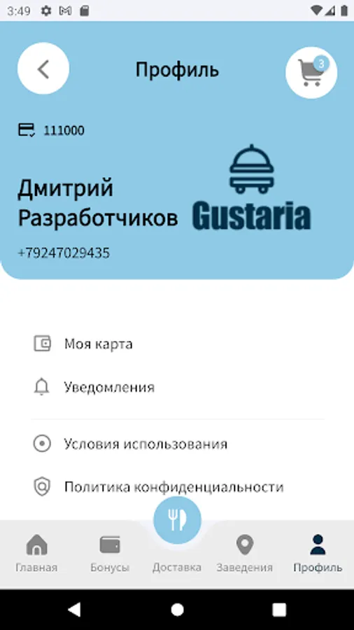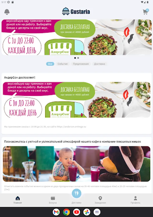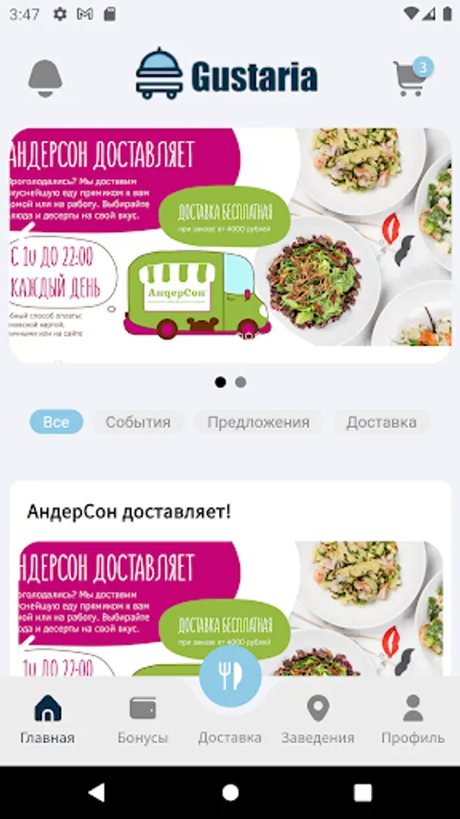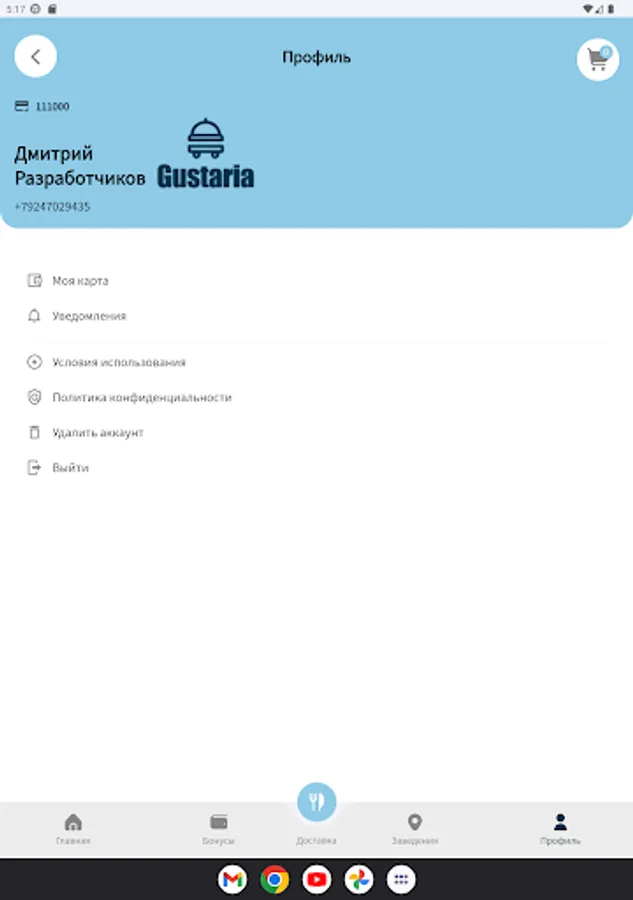 An application for organizing food delivery services for the Gustaria restaurant chain. The application provides access to the range of dishes and also allows you to order delivery. The application also provides access to the loyalty program. Using our loyalty program, you can accumulate points and spend them on new orders.