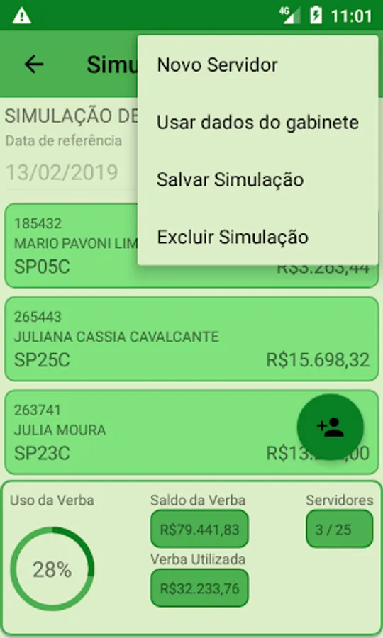 The SIM application allows the calculation of the cabinet budget based on the remuneration of the positions of the servers. For this, the user must inform the positions occupied by each one of the servers of the cabinet.