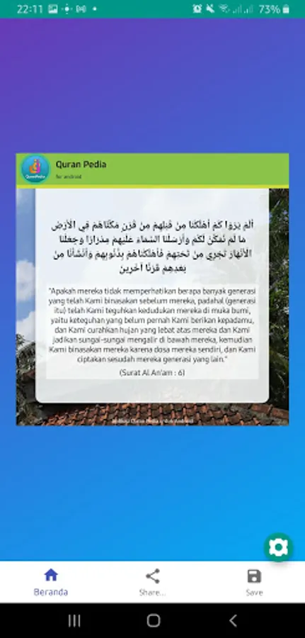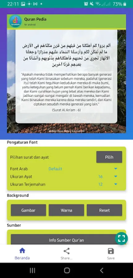 - Create mini posters of the verses of the Qur'an with customization of appearance, size, color, and font.