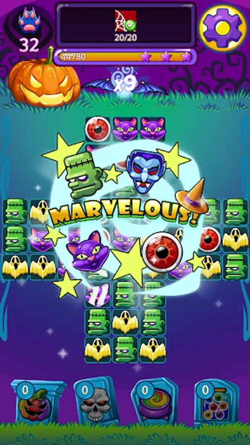 Challenge friends to see who’s best at the top of the leaderboards. Send free gifts to each other and collect daily rewards with your Facebook friends. Super powerful and magic! The amazing graphics take your experience and magical adventure to the next level! Cast spells over the halloween puzzle items and use powerful boosters to gain extra scores. Win this match 3 game over your friends and advance through the magical halloween witch puzzle world now! Start matching the pumpkin and skulls!