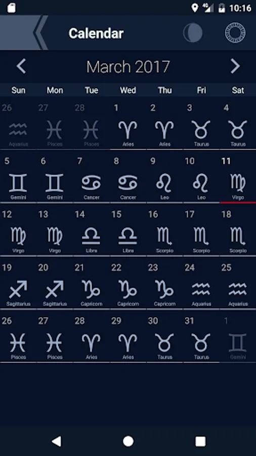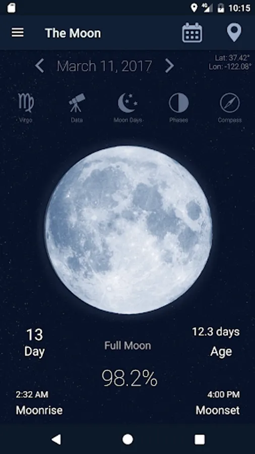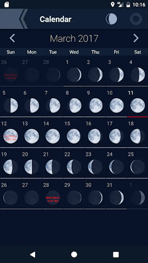 Moon Phases Calendar - universal lunar calendar for any Locations from 0001AD to 2100 years.