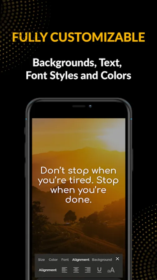 Our inspirational and motivational app works as a quotes maker where you can change the background of the quote, the appearance of the text, the text color, or change its font style.