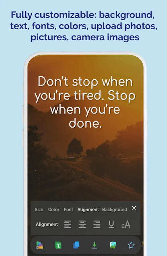 Fully customizable: Change background, text, fonts, colors, upload photos, pictures, and camera images for quotes, and works like a quotes maker.