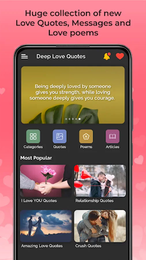 Our App Deep Love Quotes contains the best love quotes to help you find a beautiful way to tell the person who has your heart exactly how much you care. There are also plenty of famous quotes about love that can help you. Show your love by sharing Romantic quotes and messages, love poems with your boyfriend, girlfriend, wife, or husband 💖.