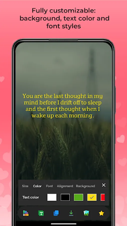 Fully customizable: Easily change the quote text colors, size, and font style with a variety of fonts to choose from and backgrounds from the gallery or camera pictures, and choose from millions of free photos from Unsplash and Pixabay.