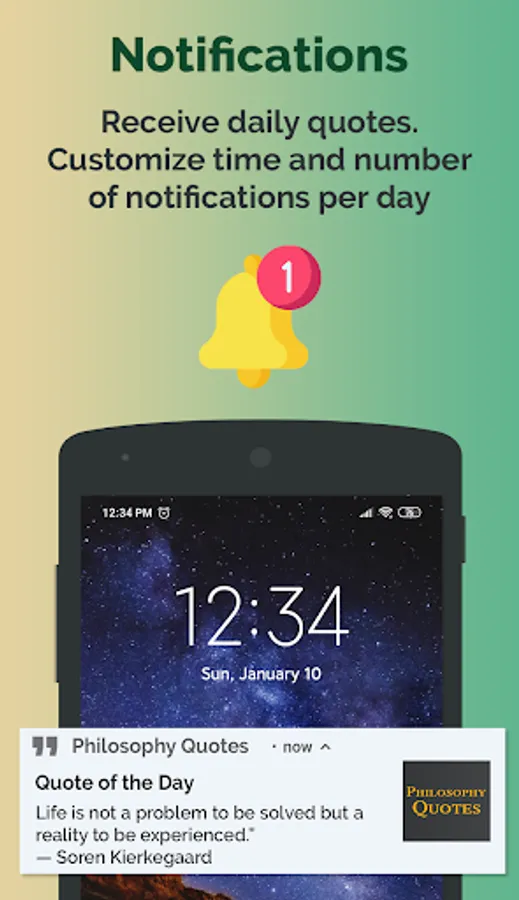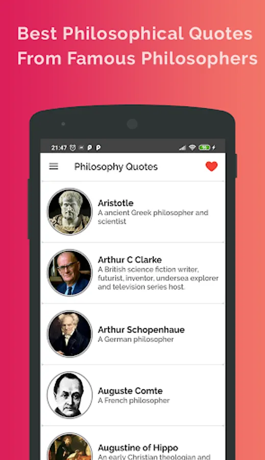 Welcome to the world of The Greatest Philosophy Quotes about life which are still applicable to today's world. In the app, you will find some of the most important philosophical quotes from the most famous philosophers of all time. Our goal is to help you find the best philosophy quotes on motivation, inspiration, and wisdom you need to live a good and simple life. These Beautiful daily quotes app will make your day magical and the Motivational quotes with images motivate and inspire you.