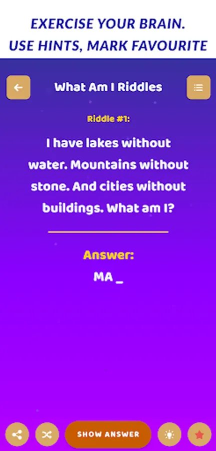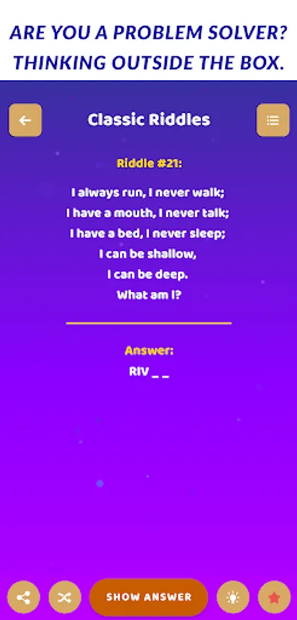 • Select and add riddles to 'favorites' and can solve them later and Riddles for smart people.