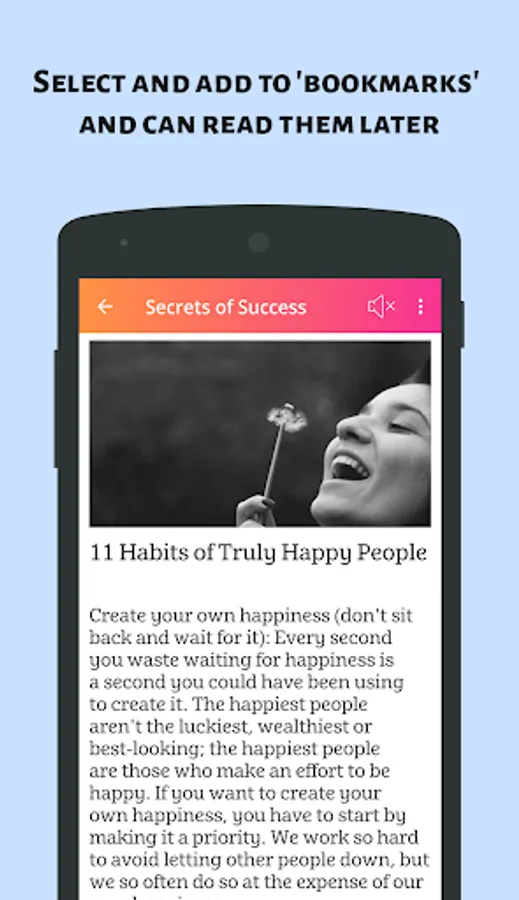 Success Achiever app contains Books and Articles on achieving Success, Happiness, and Productivity, Boosting your self-esteem, and Positive Quotes. These books can help you form better habits, improve your relationships, learn to lead, and help guide you toward successful careers and relationships.