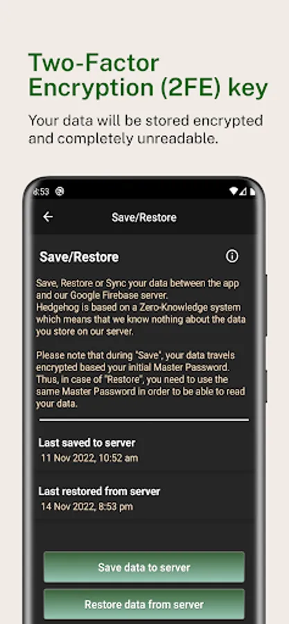Save, Restore or Sync your data between your Android device and our Google Firebase server. Please note that Hedgehog is using a Two-Factor Encryption (2FE) key which means that your data will travel encrypted and completely unreadable.