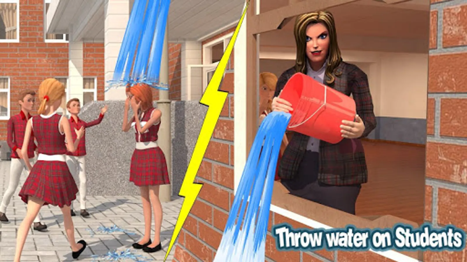 The 3d evil teacher overheard some high school students talking against her. The 3d scary maestra went to the upper high school class and threw water on the high school students from the window of the school class. The 3d bad maestra scare the high school students like scary evil miss eat their food and send them to principal office in high school simulator games.