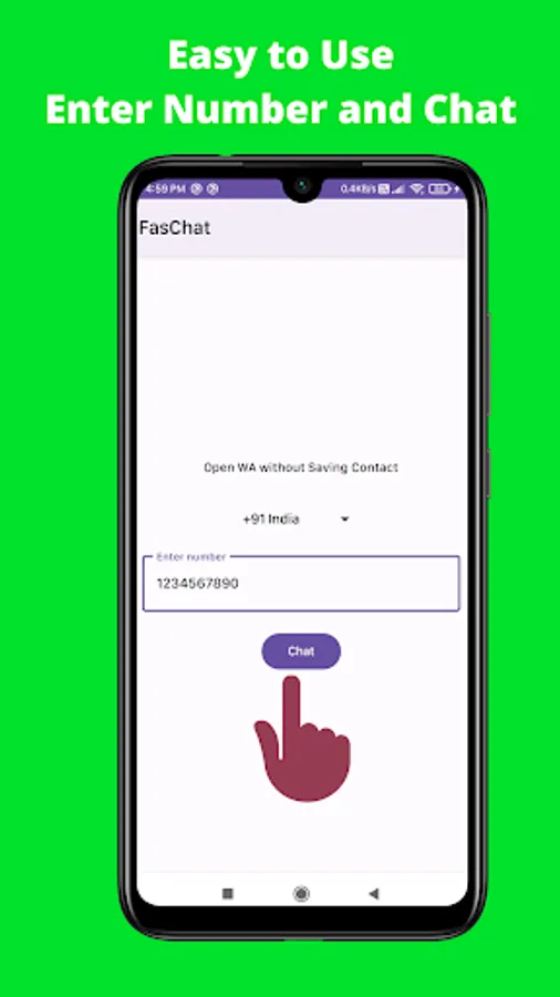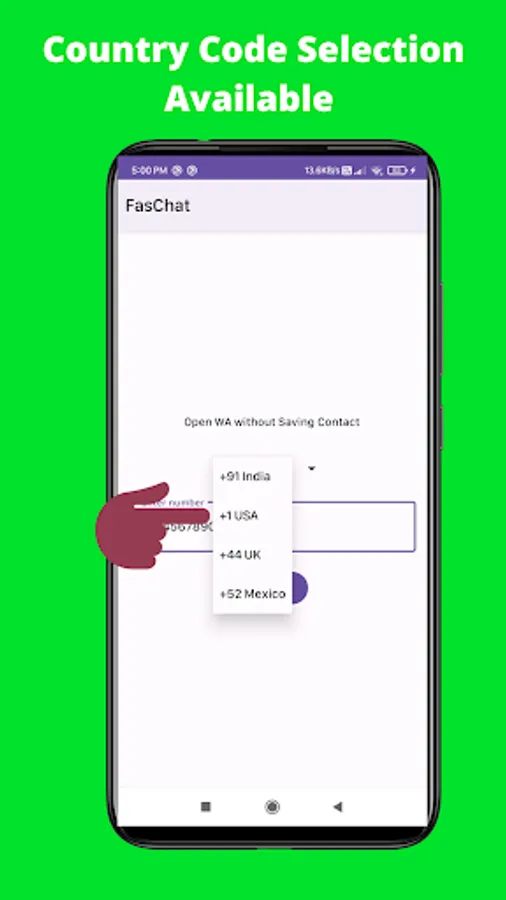 This app allows to chat with WA users without saving number in contact. It will ask to enter number with selecting the country code and press chat button to chat with that respective person.