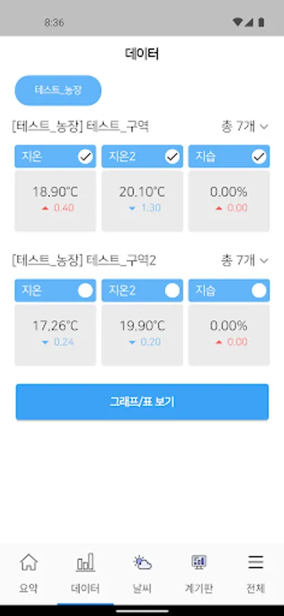 2. Check the registered farm's temperature/humidity, CO2, and solar radiation through the farming instrument panel.