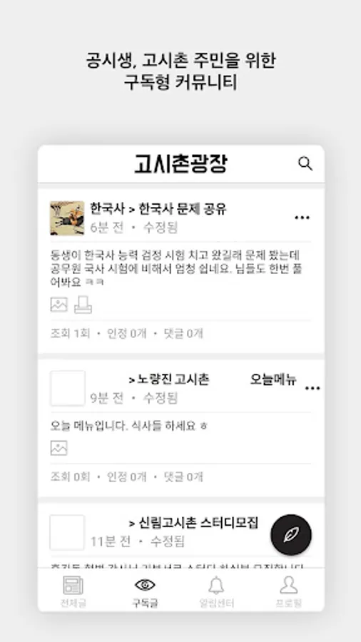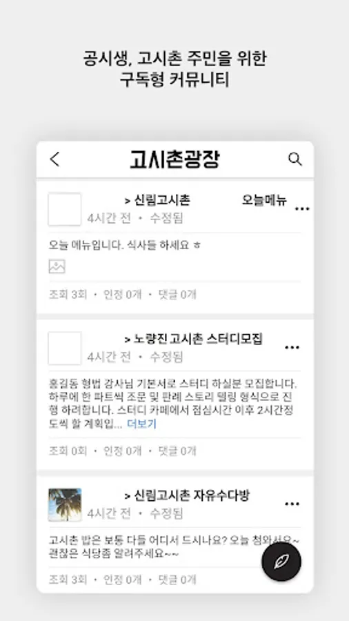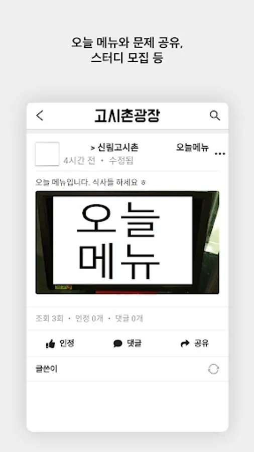 The national community for information officials of neighboring residents, incumbent or officials of major municipalities (Sirim, Noryangjin, etc.). Today's menus are located in nearby exam restaurants, such as study recruitment, exam information sharing, problem sharing, conversations with current government officials, and job listings.