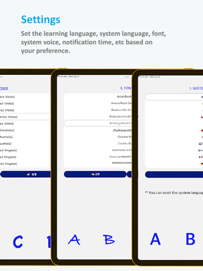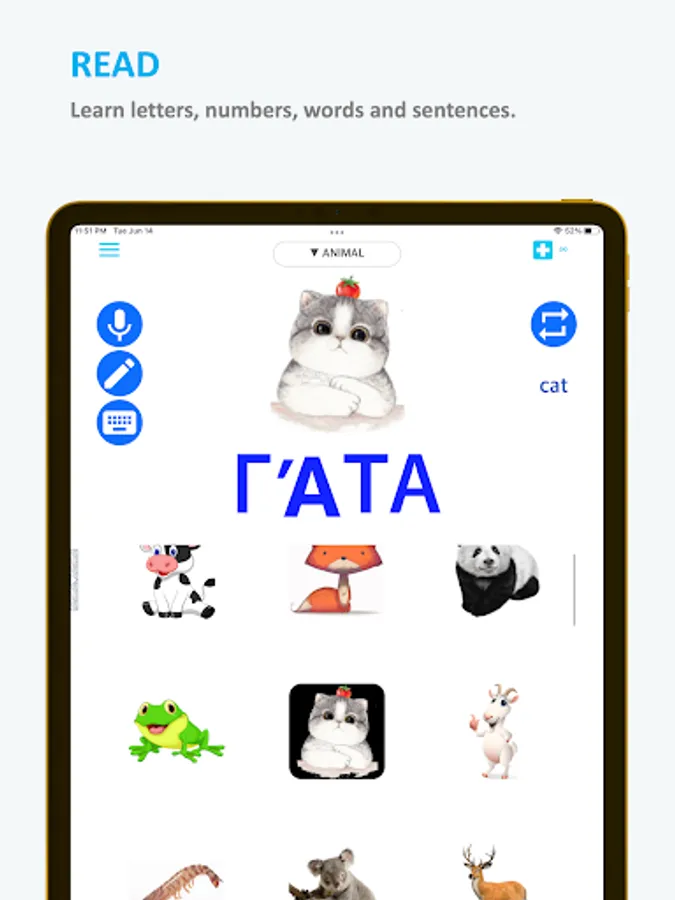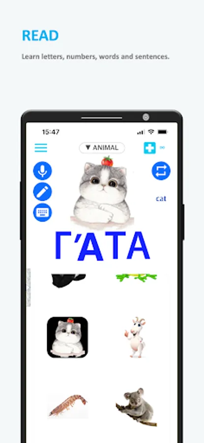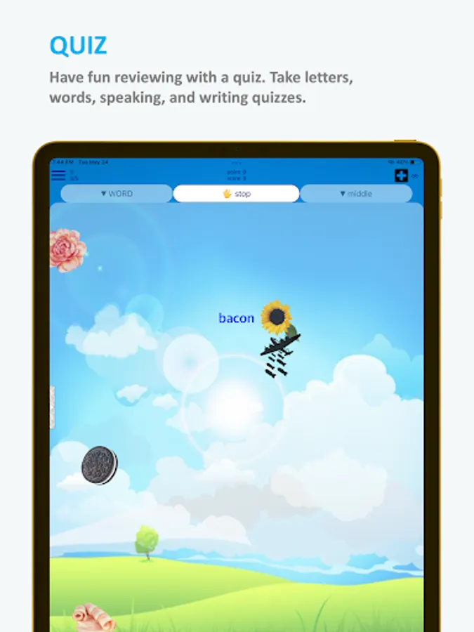Our app provides reading, listening, speaking, and writing learning quizzes. Match words to images, click on moving letters or numbers, and compare your quiz results to other users'. Children will especially enjoy the quiz games.