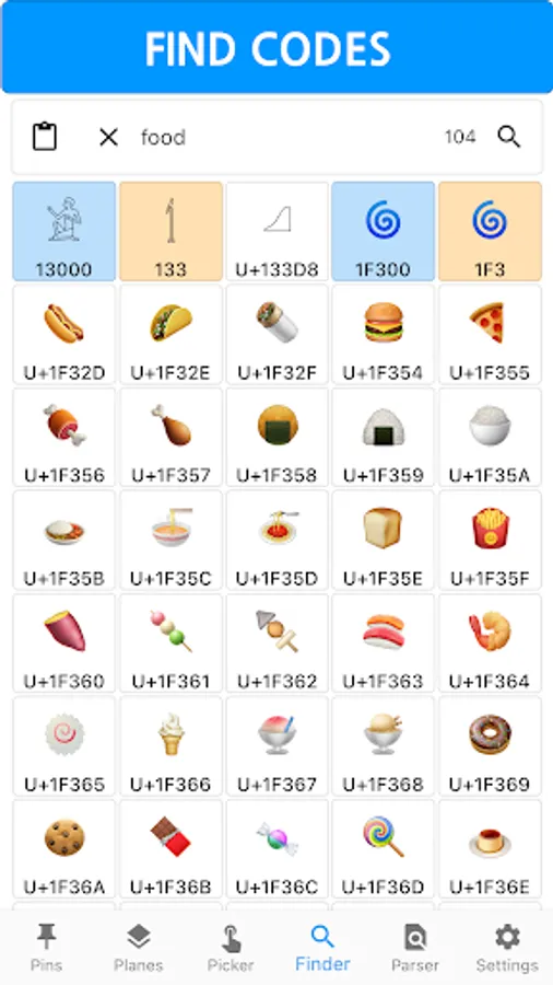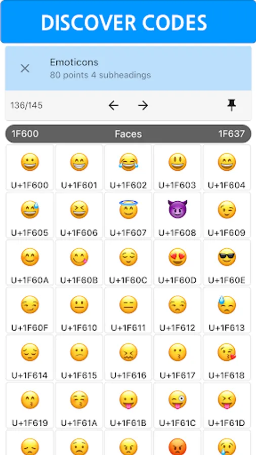 Use hexadecimal numbers such as U+1F600 to find Unicodes.