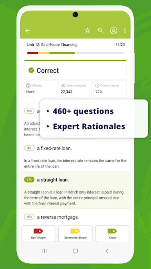 Our real estate learning app offers all the resources and supports you need to succeed and become a successful real estate agent one day. Practice with 460+ real estate prep questions, quizzes, flashcards, must-know terms, and top strategies for passing the exam. Study for a real estate license with confidence and get one step closer to the real estate agent career you always wanted! Study smart, pass the real exam, and improve your life!