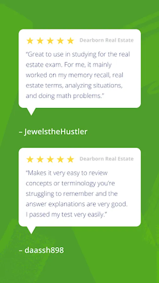 Many Prep Schools recommend our app, amongst others, to prepare you efficiently and confidently for the final test. Dearborn was used by 74% of new realtors in 2022 to pass their exams. Your Real Estate License is only a mere download away!