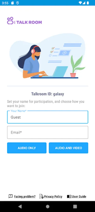 When another person will join a room with the same room name or click join link you will be able to talk and see him.
