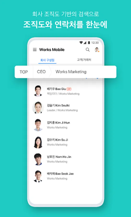 5. Address Book: An address book where you can see the company organization chart and contacts at a glance