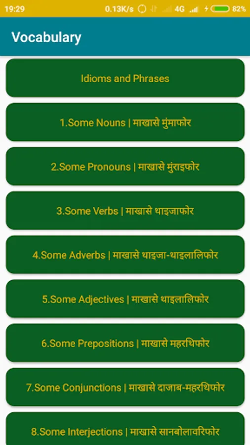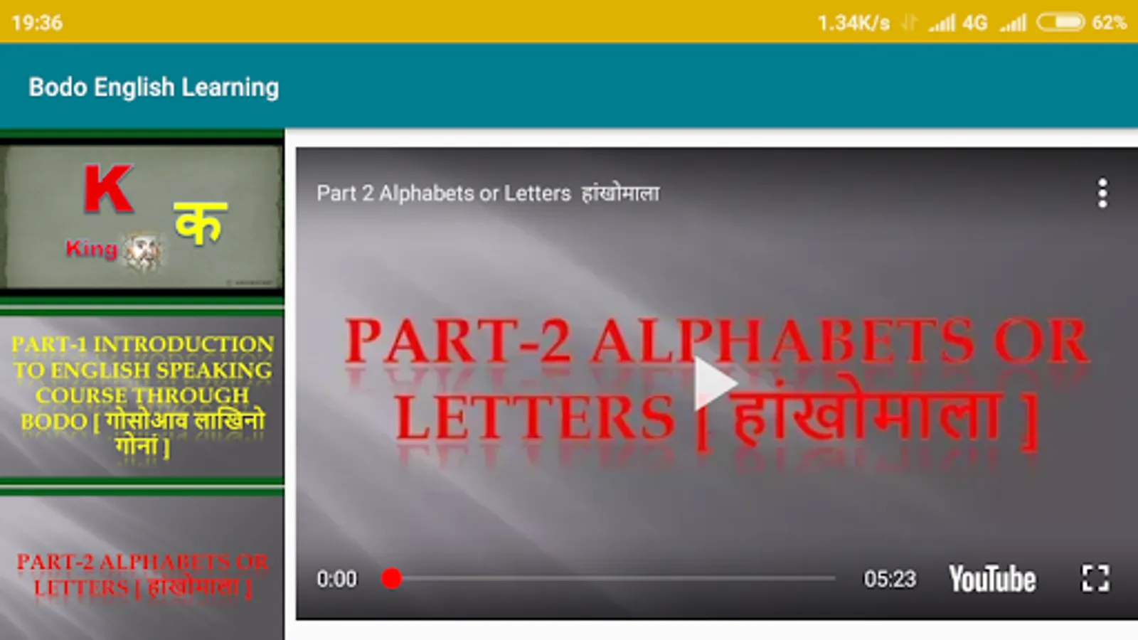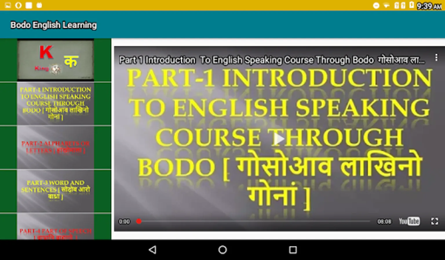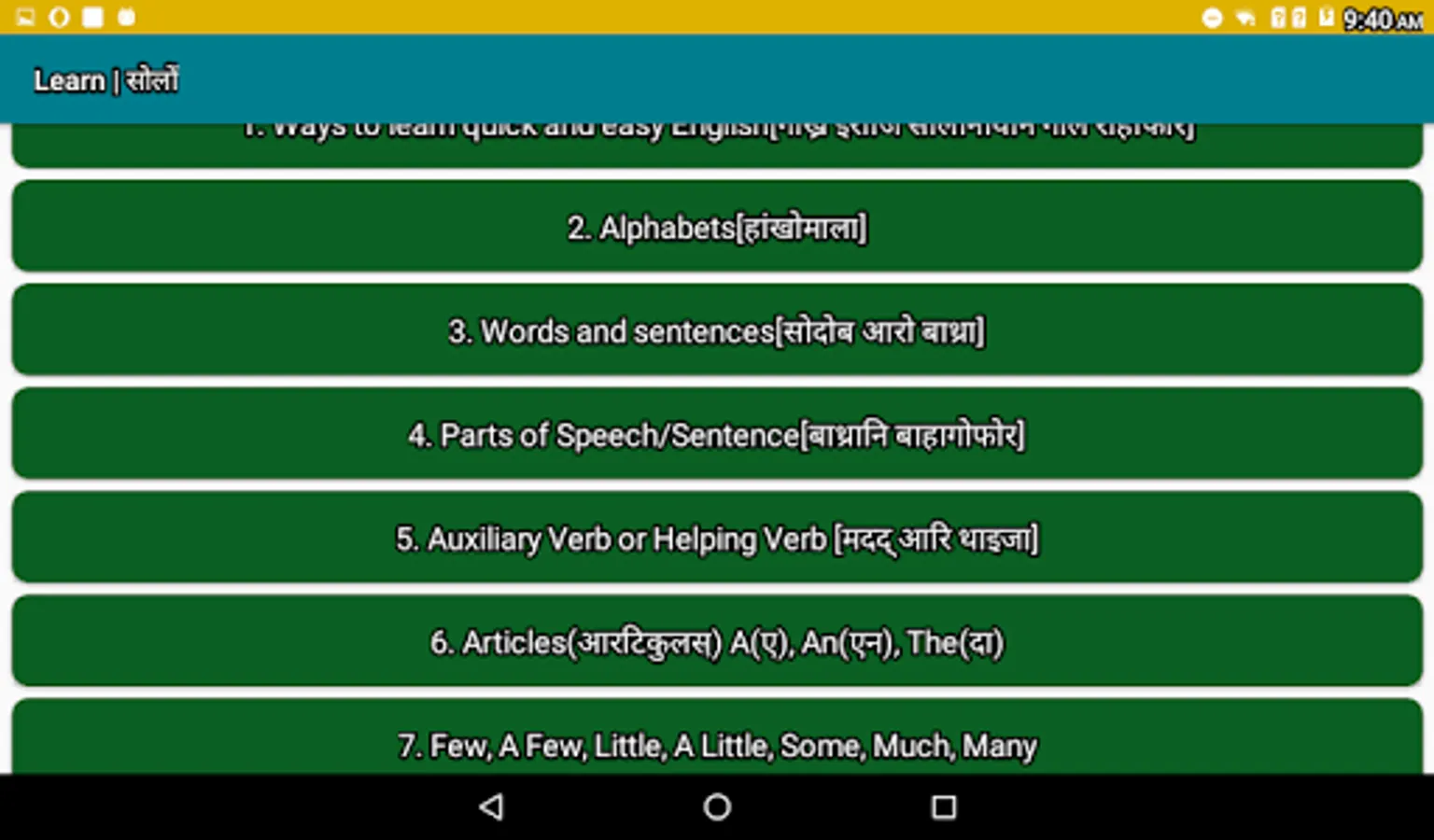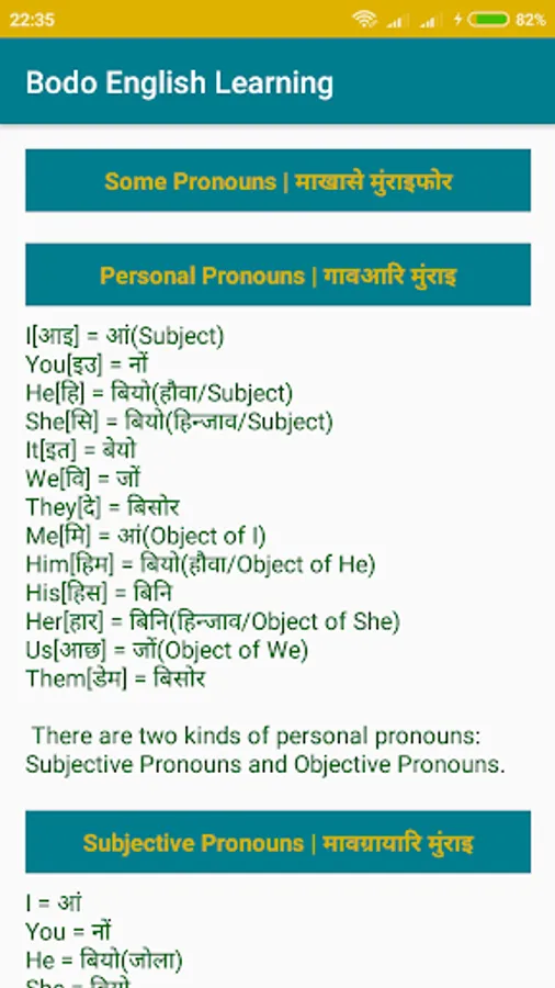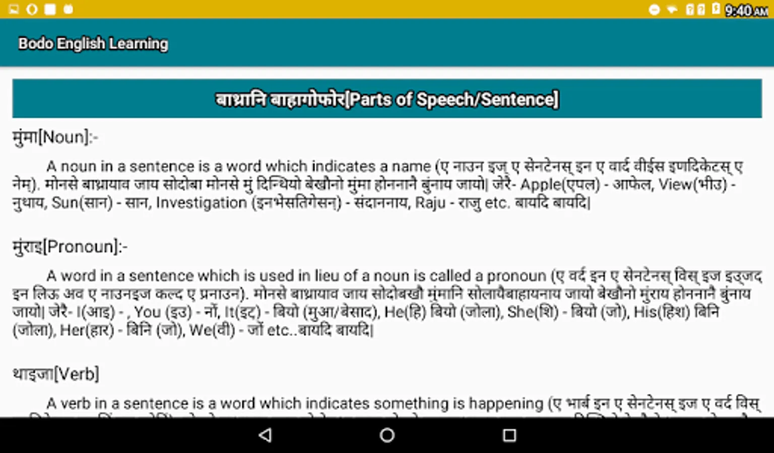 This application covers the fundamental basic English grammar necessary primarily to learn English through Bodo language. We would like to add more lessons, videos and some great features in upcoming days so stay tuned and update our Application regularly.