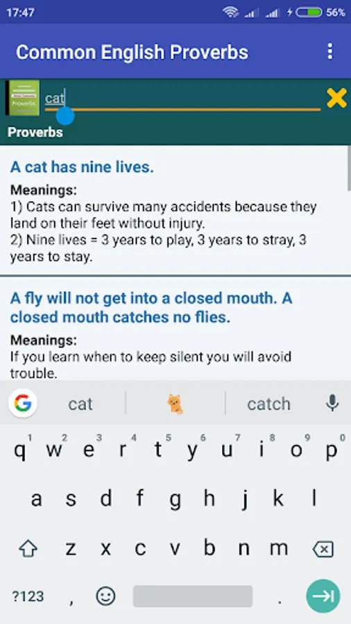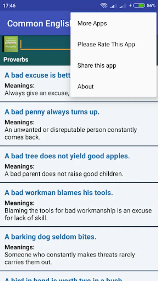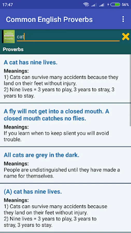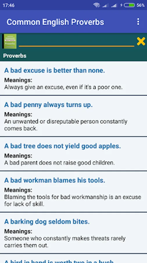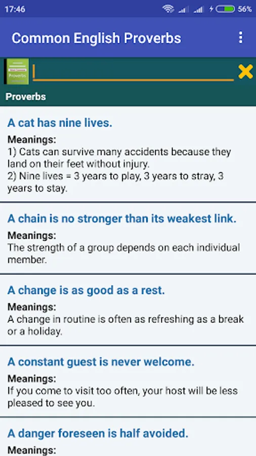 This application features commonly used English Proverbs with clear easy to understand description to learn or enrich your English proverb knowledge store.