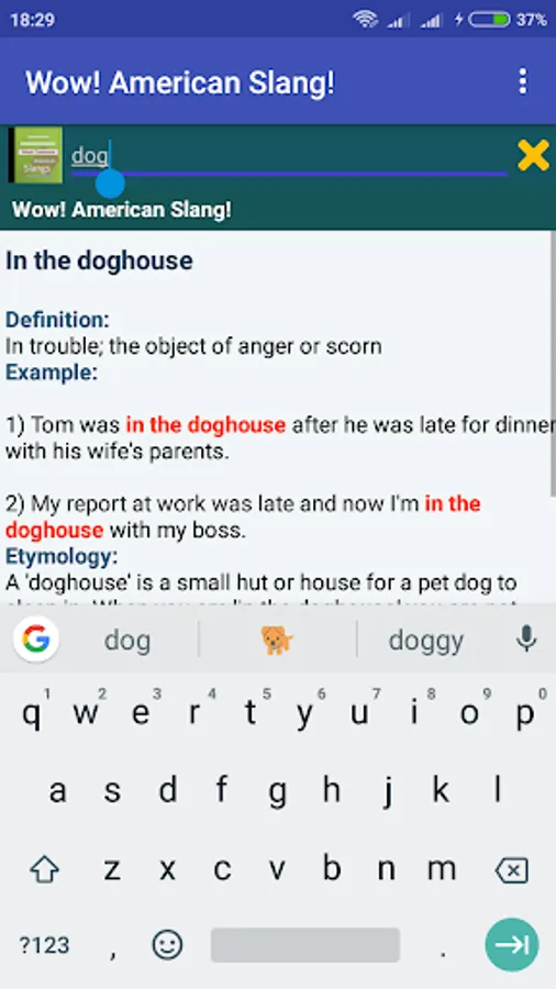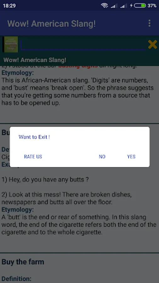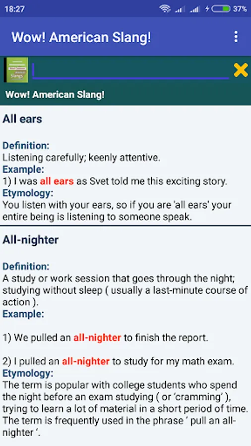 * Wow ! American English Slang! dictionary Android Application gives you a huge collection of American English Slang in easy searchable with any keywords you want and Superb understandable way of description what exactly the highlighted Slang is meaning and finally with super easy two example. Etymology for the slang words are provided and also some synonyms for some slang. So, there is no way you would not understand what American English Slang you have read. Get American Slang if you don't know and talk or understand like native American.