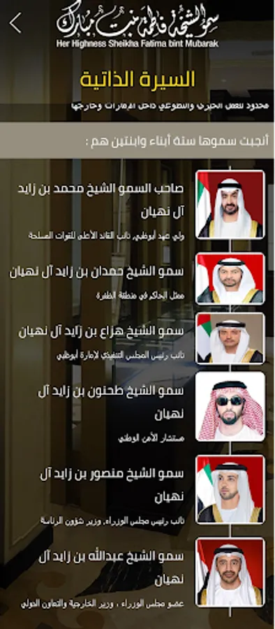 Her Highness Sheikha Fatima bint Mubarak Al Ketbi was born in Al Hayer, Al Ain, in the Emirate of Abu Dhabi. She lived her childhood in the confines of a conservative, devout Bedouin family. Her Highness loved the simplicity of Bedouin life and its values, and derived her personality and culture from them.