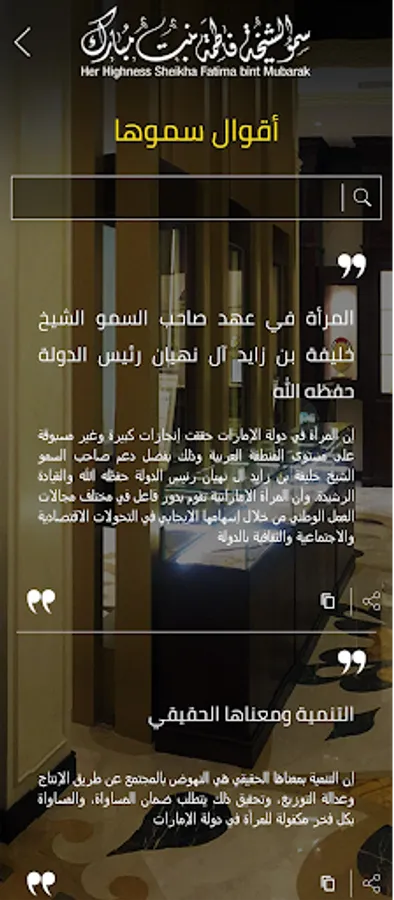 Her Highness Sheikha Fatima bint Mubarak accompanied Sheikh Zayed bin Sultan during his reign of the Emirate of Abu Dhabi and his presidency of the United Arab Emirates, and she was closely associated with him as he was her first teacher and inspiration. Her Highness devoted most of her time and attention to taking care of her husband, sons and daughters, and was devoted to their service. She lived through his intense preoccupation during the years of the political movement, and contributed to the formulation of his success story, of which the founding of the United Arab Emirates on December 2, 1971 is one of the most prominent chapters. All of these factors had a profound impact on Her Highness's career, as they contributed to crystallizing her intellectual formation and preparing her to assume the heavy responsibilities that she assumed in later stages.
