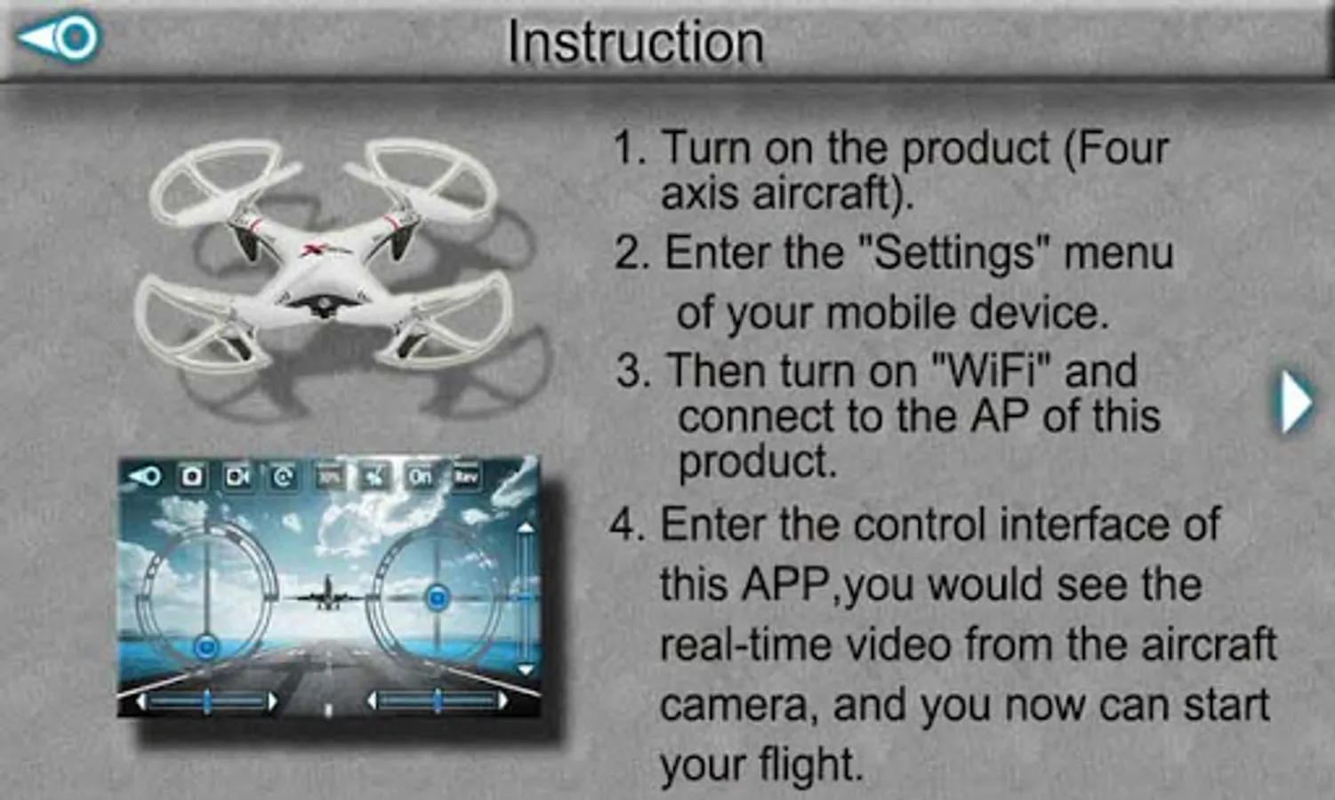 This APP can control the 4-axis aircraft by WiFi on the Android smartphone, and also can get the real time video from the aircraft, and take the photo and save the video .