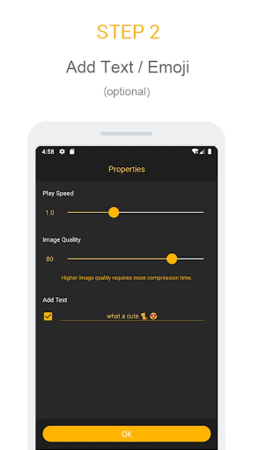 This APP main function is to compress GIF, can also be used as a GIF editor and GIF Viewer. Add text on GIF to make gif sticker.