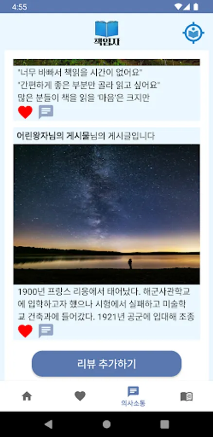 You can search for book information and know the location of a nearby bookstore through location-based services. You can record your readings using your own photos and communicate with people about books!