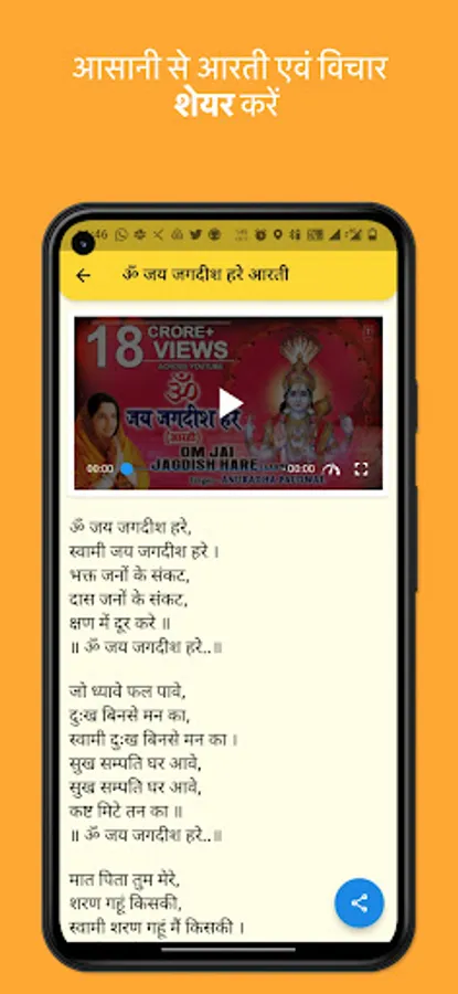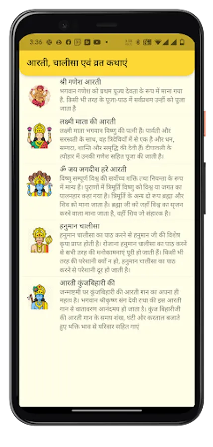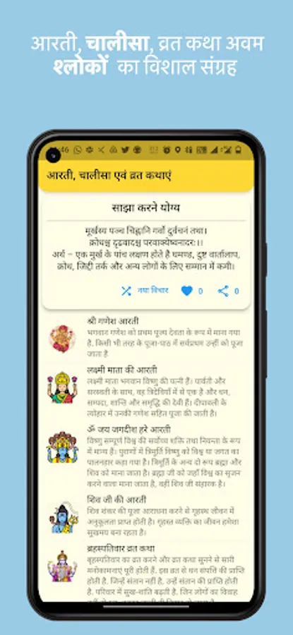 Our Aarti Sangrah app contains these categories of content in Hindi: Arti Chalisa Mantra and Vrat Katha Sangrah, Sampurnpa Arti Sangrah, Aarti Sangrah, Aarti Sangrah With Audio, Aarti Sangrah Video in Hindi, Aarti Sangrah, Aarti and Chalisa sangrah, Arti and Vrat Katha Sangrah
