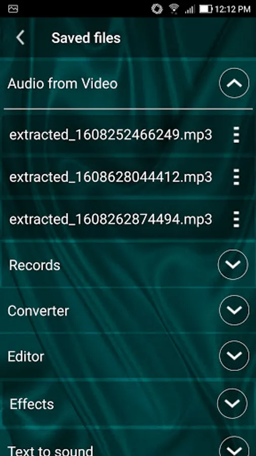 - Audio from Video. Load video file and extract audio file. Extracted audio file are automatically saved to the device memory without video file and can be used as any other audio files.