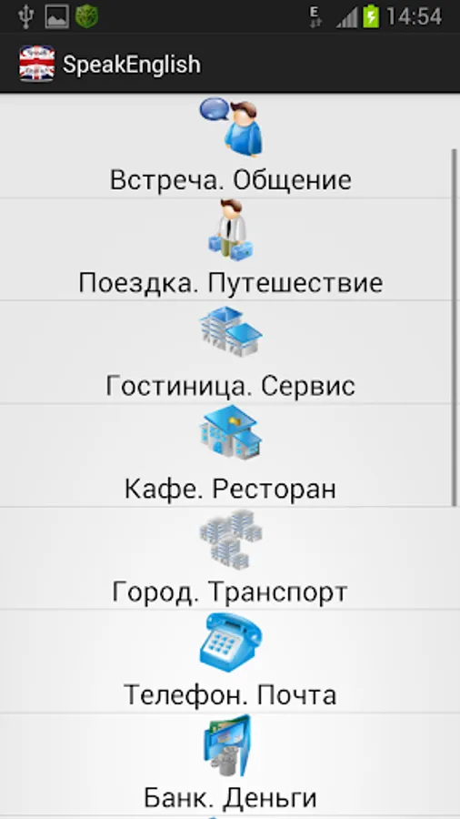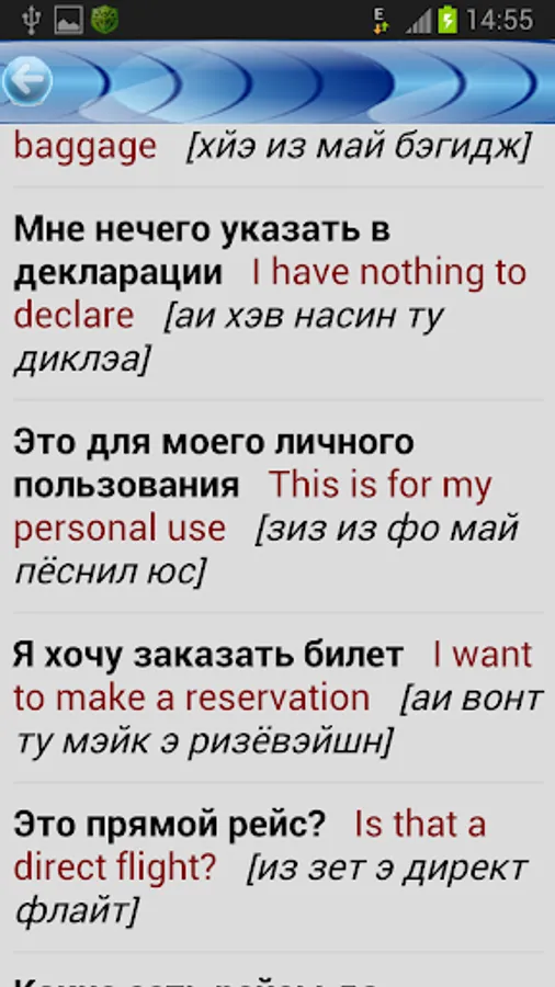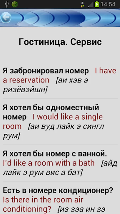 Russian-English Phrasebook program-collection of phrases and sentences. For users ' convenience the material is divided by themes: travel, accommodation, city, transport, etc. Also provides transcription in Russian.