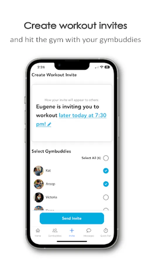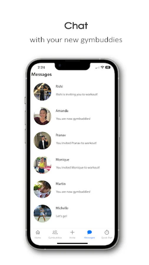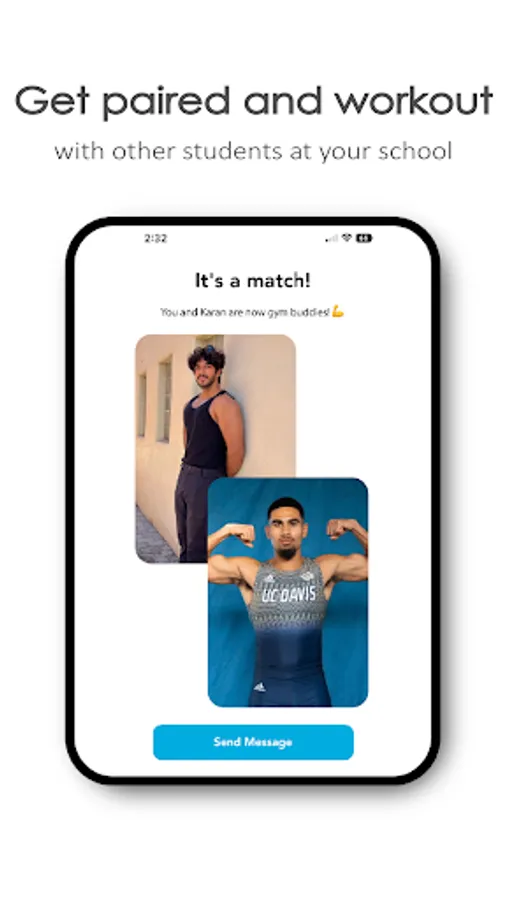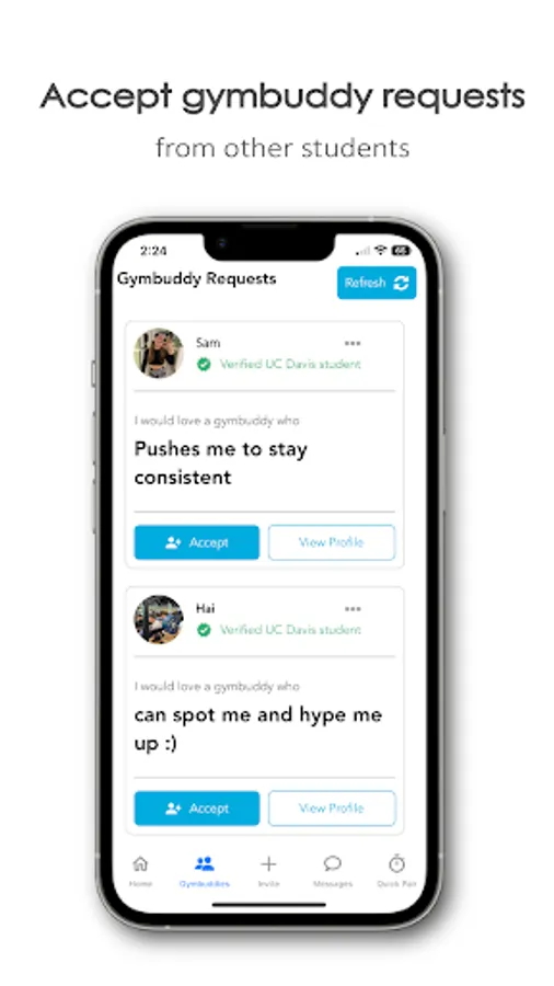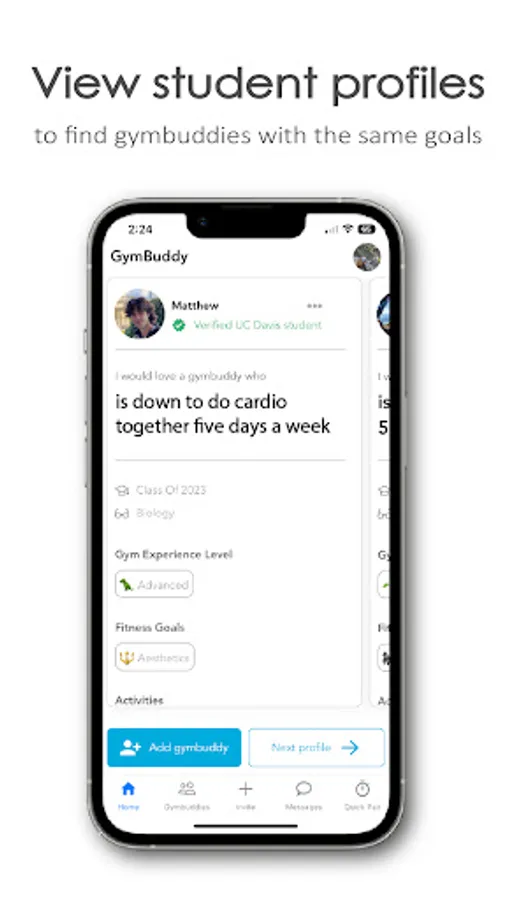 View student profiles on GymBuddy to find gymbuddies with the same fitness goals or try our Quick Pairing feature to be automatically paired up with another student.